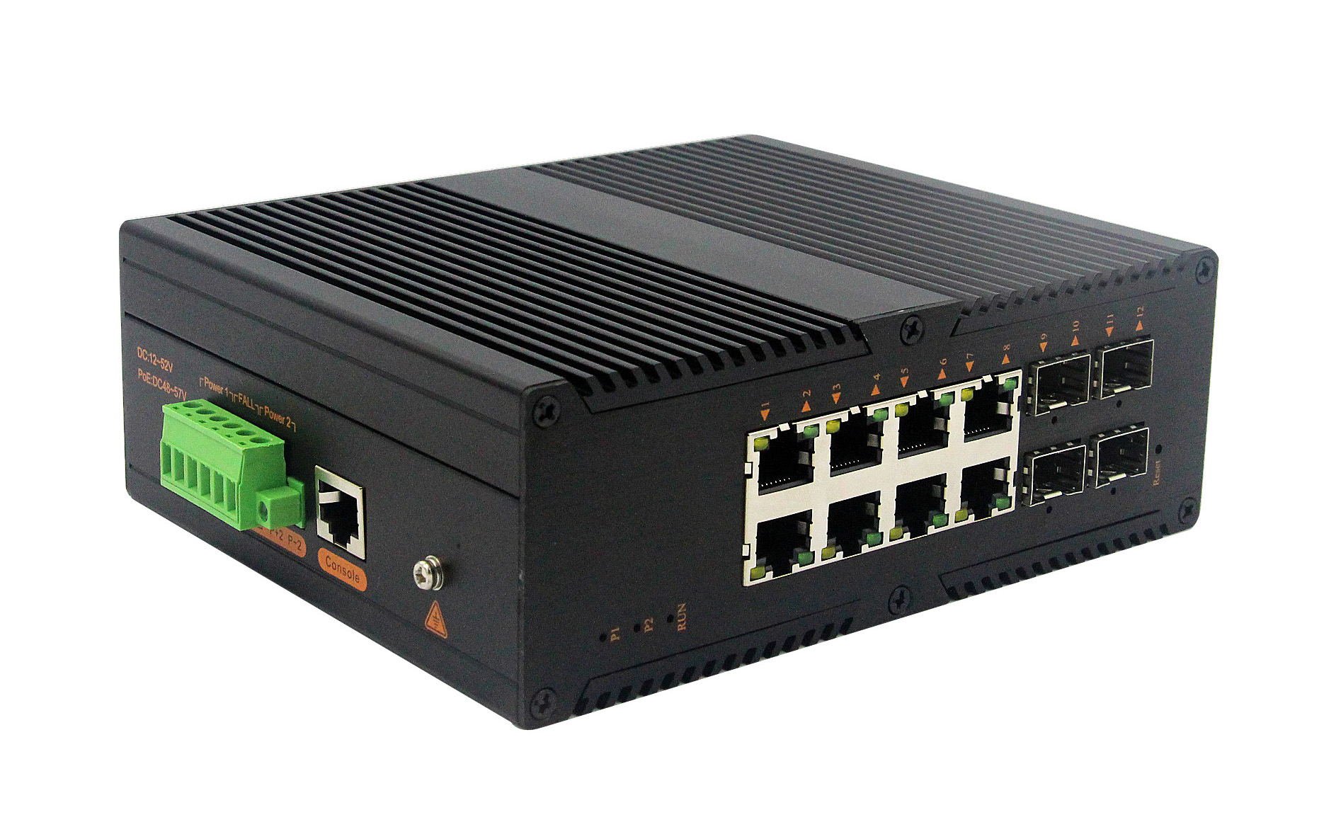 4個千兆光+8個千兆自適應電口、SFP接口、DC12-52V供電 |