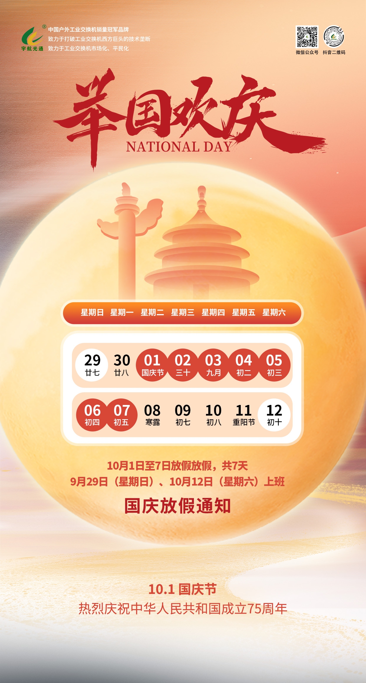 輝煌75載,祖國萬歲!宇航工業交換機與您共度華誕!