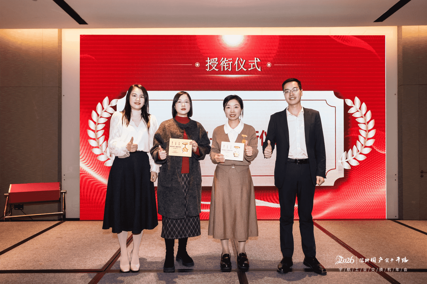 緊接著,宇航工業交換機聯席總經理劉偉成先生上臺,宣布了2025年度新晉身股獲得者名單:柳坤、宋書明、王超和楊慶輝。國產化之路從來不是坦途,但正是這些在一線沖鋒陷陣的宇航人,用日復一日的堅守與突破,將"不可能"變成了"可能"。隨后,四位身股獲得者依次上臺,董事長張萬倉先生親自為他們佩戴身股勛章。現場掌聲雷動,這份沉甸甸的榮譽,不僅是對他們過去一年辛勤付出的認可,更是對他們在各自崗位上精益求精、勇于創新的肯定。