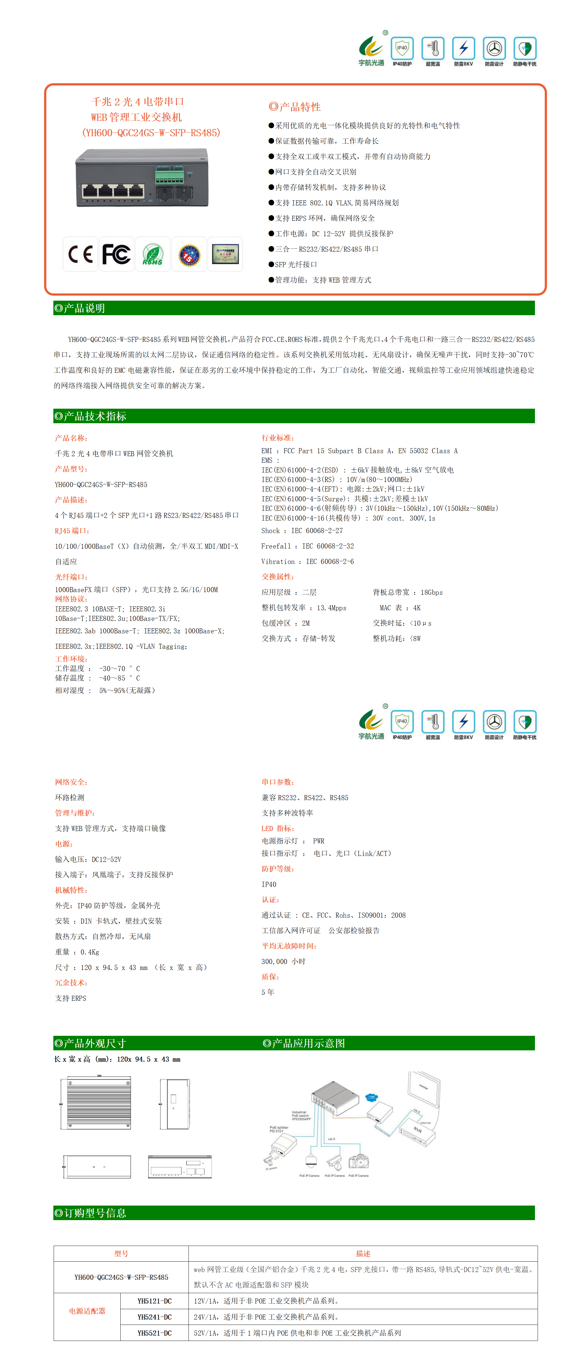 YH600-QGC24GS-W-SFP-RS485系列WEB網(wǎng)管交換機(jī),產(chǎn)品符合FCC、CE、ROHS標(biāo)準(zhǔn),提供2個(gè)千兆光口、4個(gè)千兆電口和一路三合一RS232/RS422/RS485串口,支持工業(yè)現(xiàn)場(chǎng)所需的以太網(wǎng)二層協(xié)議,保證通信網(wǎng)絡(luò)的穩(wěn)定性。該系列交換機(jī)采用低功耗、無(wú)風(fēng)扇設(shè)計(jì),確保無(wú)噪聲干擾,同時(shí)支持-30~70℃工作溫度和良好的EMC電磁兼容性能,保證在惡劣的工業(yè)環(huán)境中保持穩(wěn)定的工作,為工廠自動(dòng)化,智能交通,視頻監(jiān)控等工業(yè)應(yīng)用領(lǐng)域組建快速穩(wěn)定的網(wǎng)絡(luò)終端接入網(wǎng)絡(luò)提供安全可靠的解決方案。