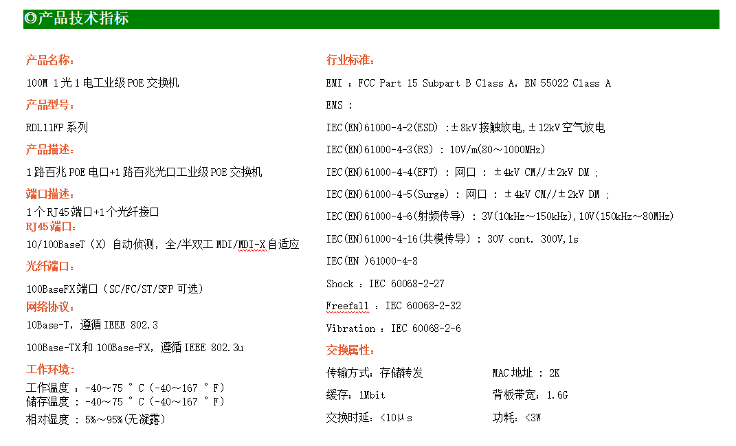 1路百兆POE電口+1路百兆光口工業(yè)級以太網(wǎng)POE交換機,支持1個10/100Base-TX電口和1個100Base-X(SC/ST/FC)光口。產(chǎn)品符合FCC、CE、ROHS標準。RDL11FP系列交換機具有-40℃~75℃的工作溫度,具有超強的堅固度能適應各種嚴苛環(huán)境,也可以非常方便的安置在空間緊湊的控制箱中。導軌的安裝特性、寬溫操作及擁有IP40防護等級的外殼及LED指示燈,使RDL11FP成為一個即插即用的工業(yè)級設備,為用戶的以太網(wǎng)設備聯(lián)網(wǎng)提供可靠、便捷的解決方案。