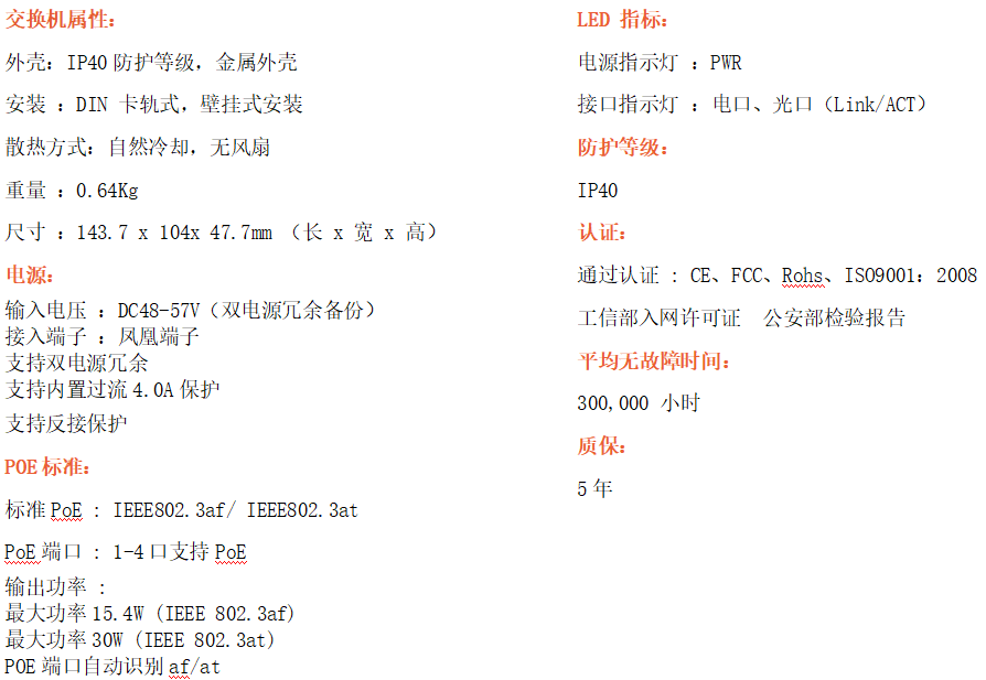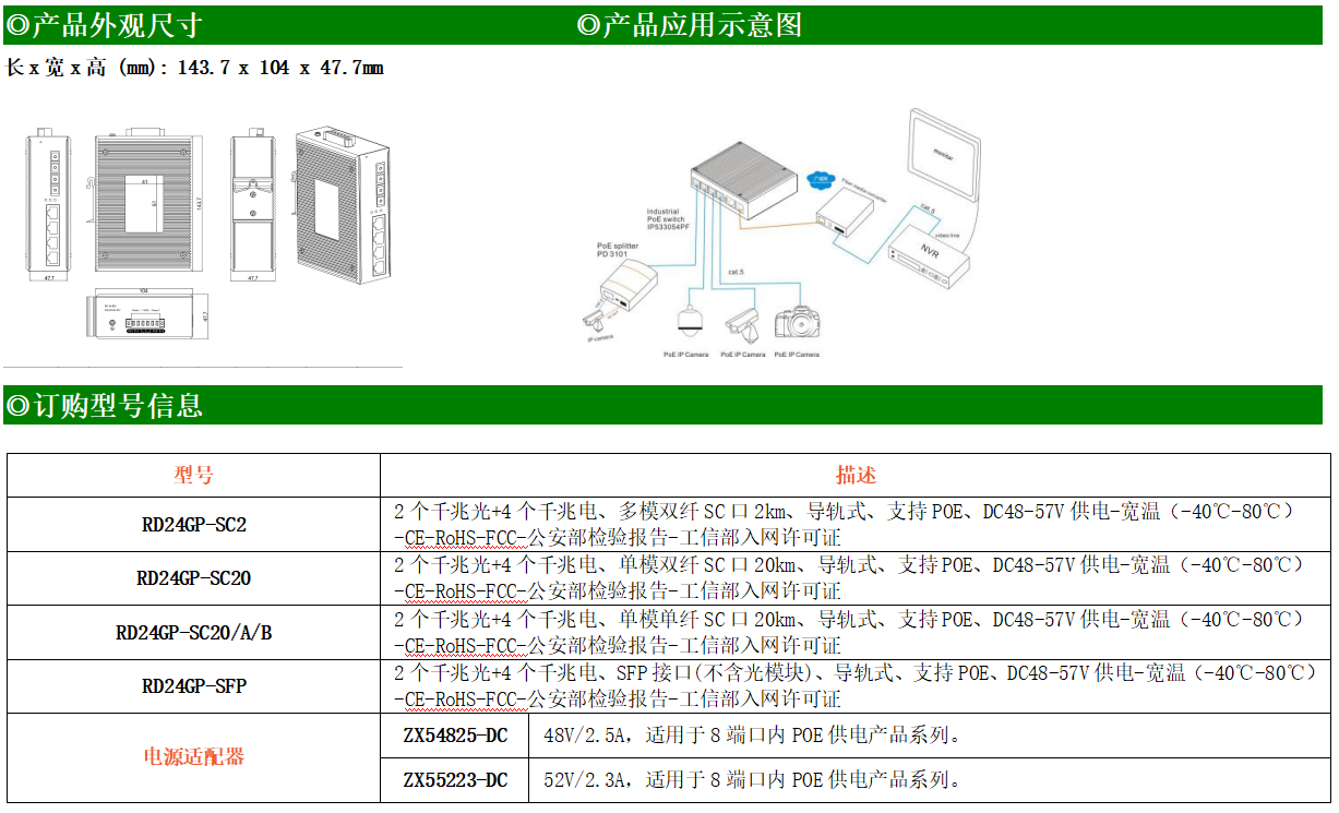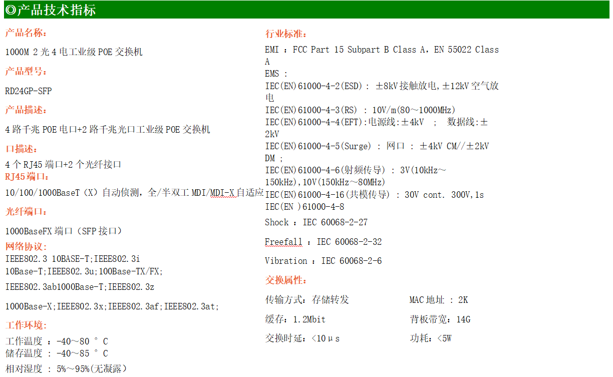 4路千兆POE電口+2路千兆FX光口工業(yè)級(jí)以太網(wǎng)POE交換機(jī),支持4個(gè)10/100/1000Base-TX電口和2個(gè)1000Base-X光口。產(chǎn)品符合FCC、CE、ROHS標(biāo)準(zhǔn)。RD24GP-SFP交換機(jī)具有-40℃~80℃的工作溫度,具有超強(qiáng)的堅(jiān)固度能適應(yīng)各種嚴(yán)苛環(huán)境,也可以非常方便的安置在空間緊湊的控制箱中。導(dǎo)軌的安裝特性、寬溫操作及擁有IP40防護(hù)等級(jí)的外殼及LED指示燈,使RD24GP-SFP成為一個(gè)即插即用的工業(yè)級(jí)設(shè)備,為用戶(hù)的以太網(wǎng)設(shè)備聯(lián)網(wǎng)提供可靠、便捷的解決方案。