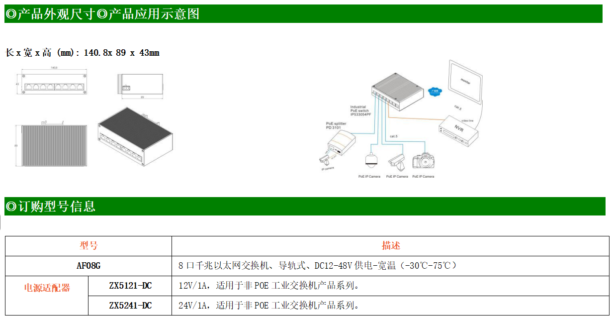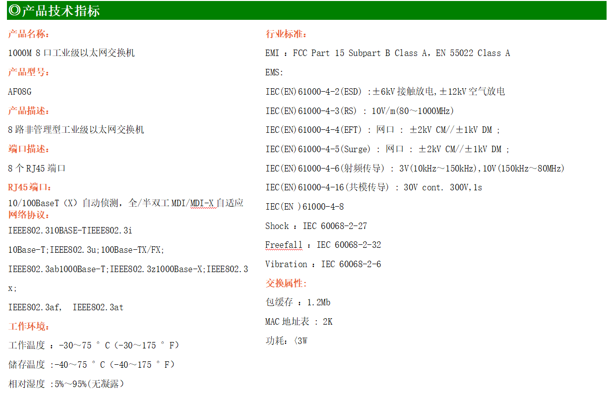 8路千兆電口工業(yè)級以太網(wǎng)交換機,支持8個10Base-T/100Base-T/1000Base-TX電口。產(chǎn)品符合FCC、CE、ROHS標準。AF08G交換機具有-30℃~75℃的工作溫度,具有超強的堅固度能適應各種嚴苛環(huán)境,也可以非常方便的安置在空間緊湊的控制箱中。導軌的安裝特性、寬溫操作及擁有IP40防護等級的外殼及LED指示燈,使AF08G成為一個即插即用的工業(yè)級設備,為用戶的以太網(wǎng)設備聯(lián)網(wǎng)提供可靠、便捷的解決方案。