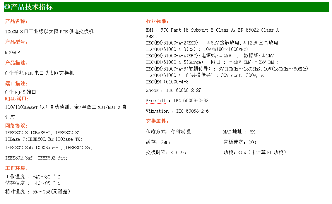 8路千兆電口工業級以太網POE交換機,支持8個100Base-T/1000Base-TX POE電口。產品符合FCC、CE、ROHS標準。RD08GP交換機具有-40℃~80℃的工作溫度,具有超強的堅固度能適應各種嚴苛環境,也可以非常方便的安置在空間緊湊的控制箱中。導軌的安裝特性、寬溫操作及擁有IP40防護等級的外殼及LED指示燈,使RD08GP成為一個即插即用的工業級設備,為用戶的以太網設備聯網提供可靠、便捷的解決方案。
