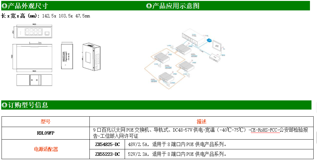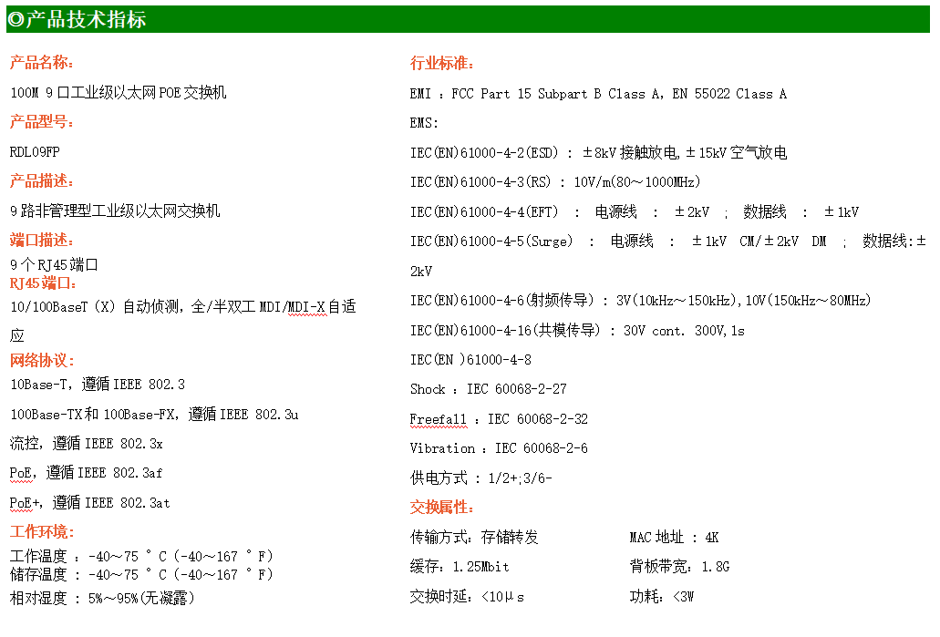9路百兆電口工業級以太網交換機,支持9個10Base-T/100Base-TX電口。產品符合FCC、CE、ROHS標準。RDL09FP交換機具有-40℃~75℃的工作溫度,具有超強的堅固度能適應各種嚴苛環境,也可以非常方便的安置在空間緊湊的控制箱中。導軌的安裝特性、寬溫操作及擁有IP40防護等級的外殼及LED指示燈,使RDL09FP成為一個即插即用的工業級設備,為用戶的以太網設備聯網提供可靠、便捷的解決方案。