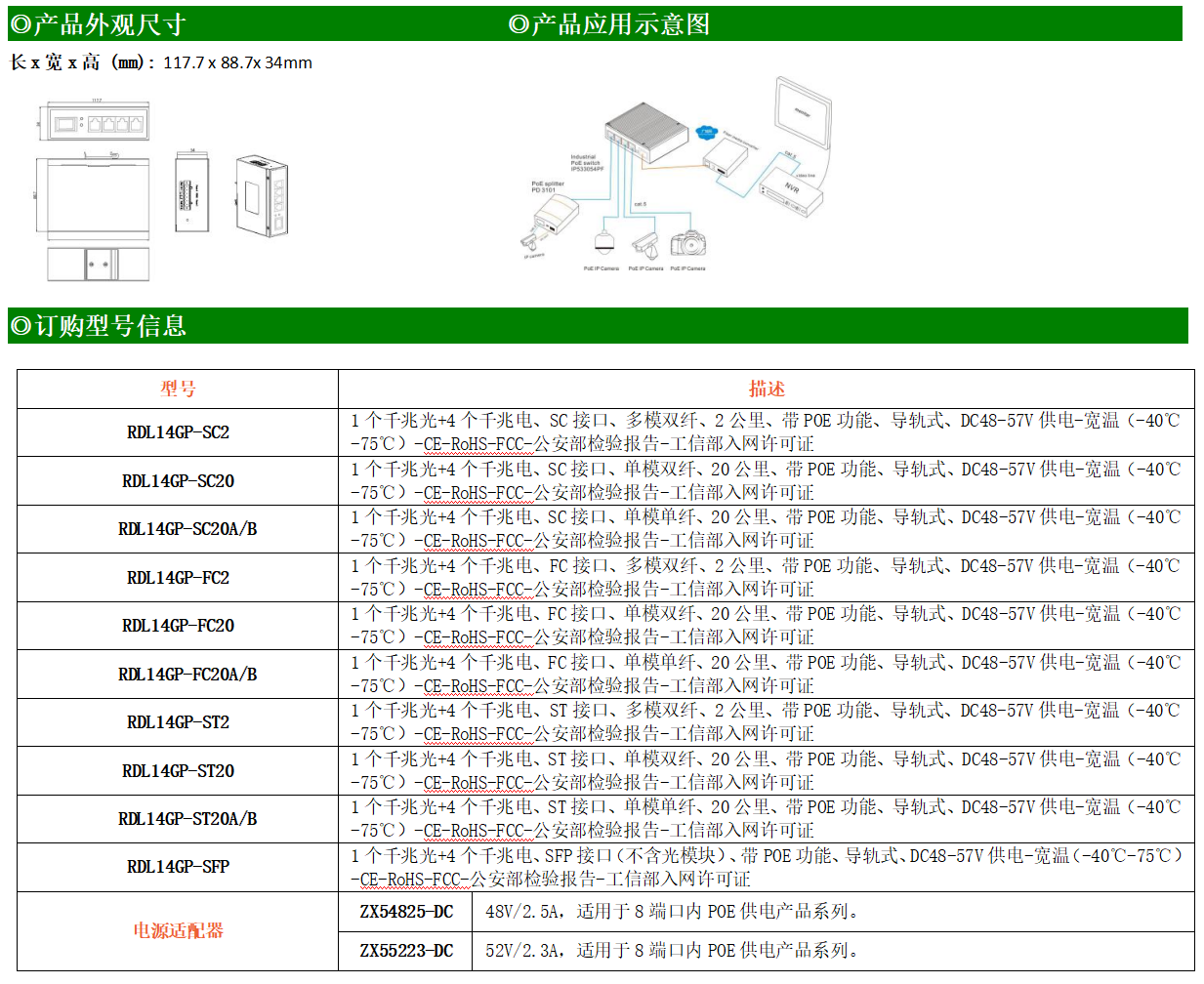 4路千兆POE電口+1路千兆FX光口工業級以太網POE交換機,支持4個10/100/1000Base-TX電口和1個1000Base-X光口。產品符合FCC、CE、ROHS標準。RDL14GP系列交換機具有-40℃~75℃的工作溫度,具有超強的堅固度能適應各種嚴苛環境,也可以非常方便的安置在空間緊湊的控制箱中。導軌的安裝特性、寬溫操作及擁有IP40防護等級的外殼及LED指示燈,使RDL14GP成為一個即插即用的工業級設備,為用戶的以太網設備聯網提供可靠、便捷的解決方案。