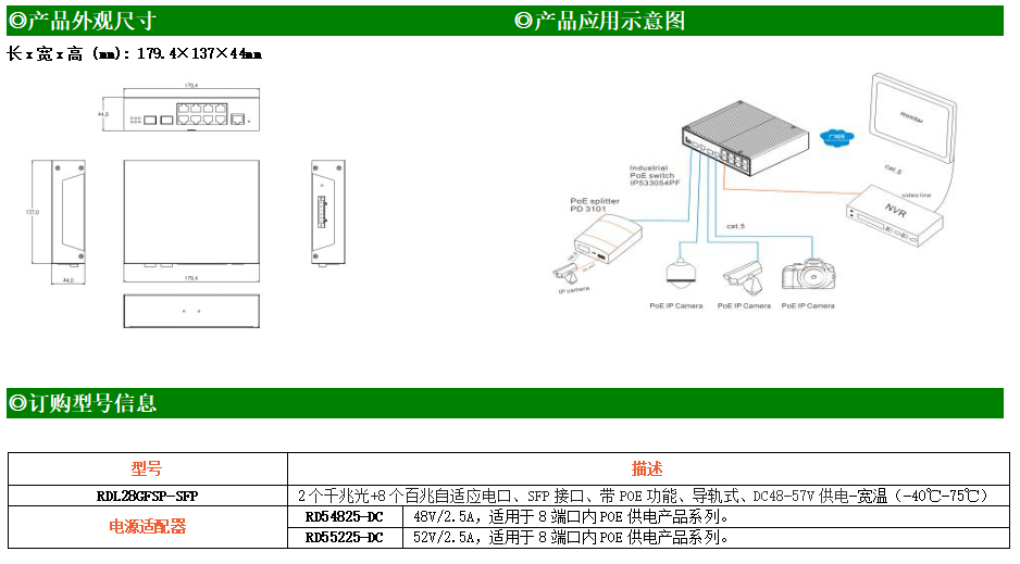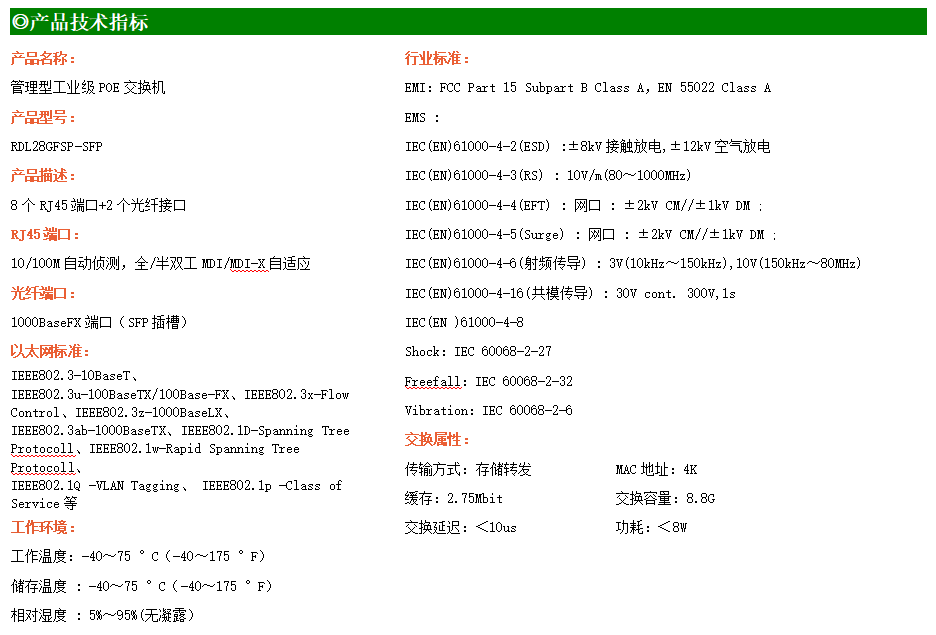 RDL28GFSP-SFP是網管型工業以太網POE交換機,產品符合FCC、CE、ROHS標準。支持2個千兆光口和8個百兆電口,支持一路console口;支持工業現場所需的以太網二層協議,保證通信網絡的穩定性;該系列交換機采用低功耗、無風扇設計,確保無噪聲干擾,同時支持-40~75℃工作溫度和良好的EMC電磁兼容性能,保證在惡劣的工業環境中保持穩定的工作,為工廠自動化,智能交通,視頻監控等工業應用領域組建快速穩定的網絡終端接入網絡提供安全可靠的解決方案。