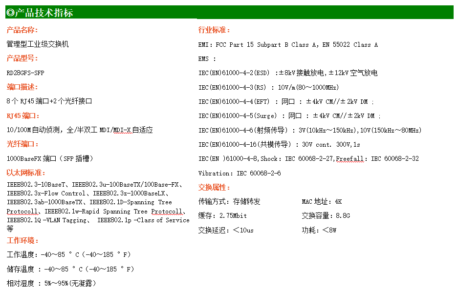 RD28GFS-SFP是網管型工業以太網交換機,產品符合FCC、CE、ROHS標準。支持2個千兆光口和8個百兆電口,支持一路console口;支持工業現場所需的以太網二層協議,保證通信網絡的穩定性;該系列交換機采用低功耗、無風扇設計,確保無噪聲干擾,同時支持-40~85℃工作溫度和良好的EMC電磁兼容性能,保證在惡劣的工業環境中保持穩定的工作,為工廠自動化,智能交通,視頻監控等工業應用領域組建快速穩定的網絡終端接入網絡提供安全可靠的解決方案。