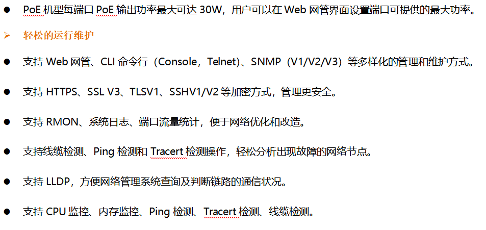 • PoE機型支持IEEE 802.3af/at PoE供電標準,滿足視覺安防、電話會議系統、無線覆蓋等場景PoE供電的需求。