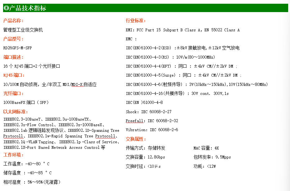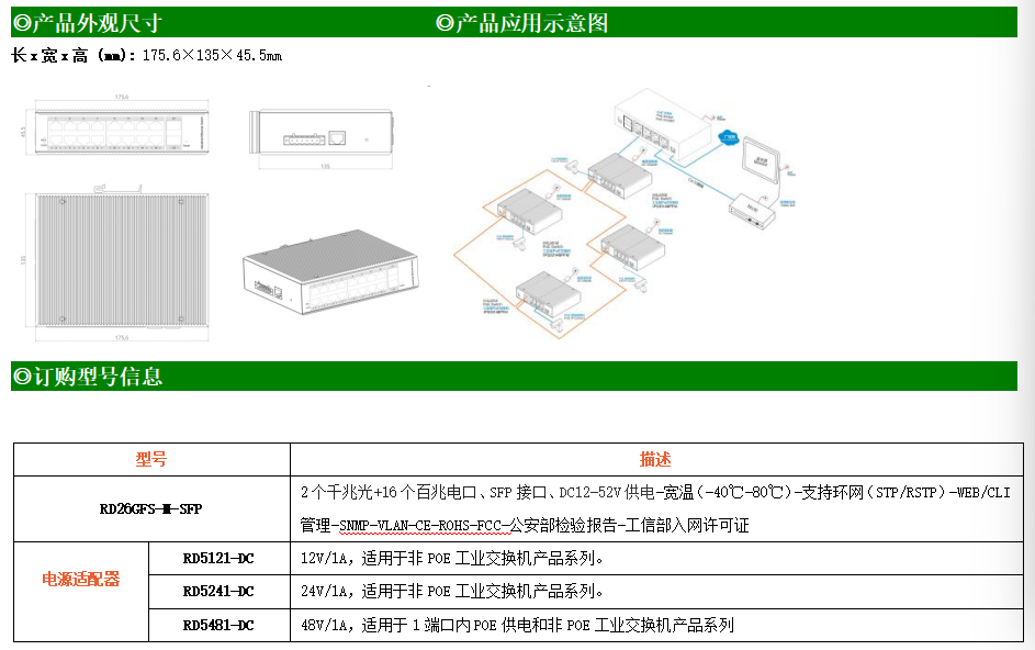 RD216GFS-M是網(wǎng)管型工業(yè)以太網(wǎng)交換機(jī),產(chǎn)品符合FCC、CE、RoHS標(biāo)準(zhǔn)。支持2個(gè)千兆光口和16個(gè)百兆電口;支持工業(yè)現(xiàn)場(chǎng)所需的以太網(wǎng)二層協(xié)議,保證通信網(wǎng)絡(luò)的穩(wěn)定性;該系列交換機(jī)采用低功耗、無(wú)風(fēng)扇設(shè)計(jì),確保無(wú)噪聲干擾,同時(shí)支持-40~80℃工作溫度和良好的EMC電磁兼容性能,保證在惡劣的工業(yè)環(huán)境中保持穩(wěn)定的工作,為工廠自動(dòng)化,智能交通,視頻監(jiān)控等工業(yè)應(yīng)用領(lǐng)域組建快速穩(wěn)定的網(wǎng)絡(luò)終端接入網(wǎng)絡(luò)提供安全可靠的解決方案。