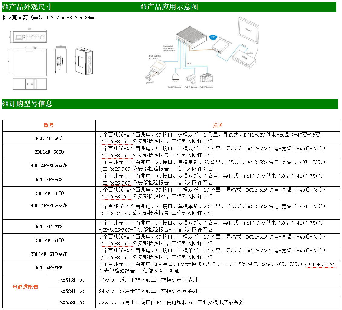 4路百兆電口+1路百兆FX光口工業級以太網交換機,支持4個10Base-T/100Base-TX電口和1個100Base-X光口。產品符合FCC、CE、ROHS標準。RDL14F系列交換機具有-40℃~75℃的工作溫度,具有超強的堅固度能適應各種嚴苛環境,也可以非常方便的安置在空間緊湊的控制箱中。導軌的安裝特性、寬溫操作及擁有IP40防護等級的外殼及LED指示燈,使RDL14F成為一個即插即用的工業級設備,為用戶的以太網設備聯網提供可靠、便捷的解決方案。