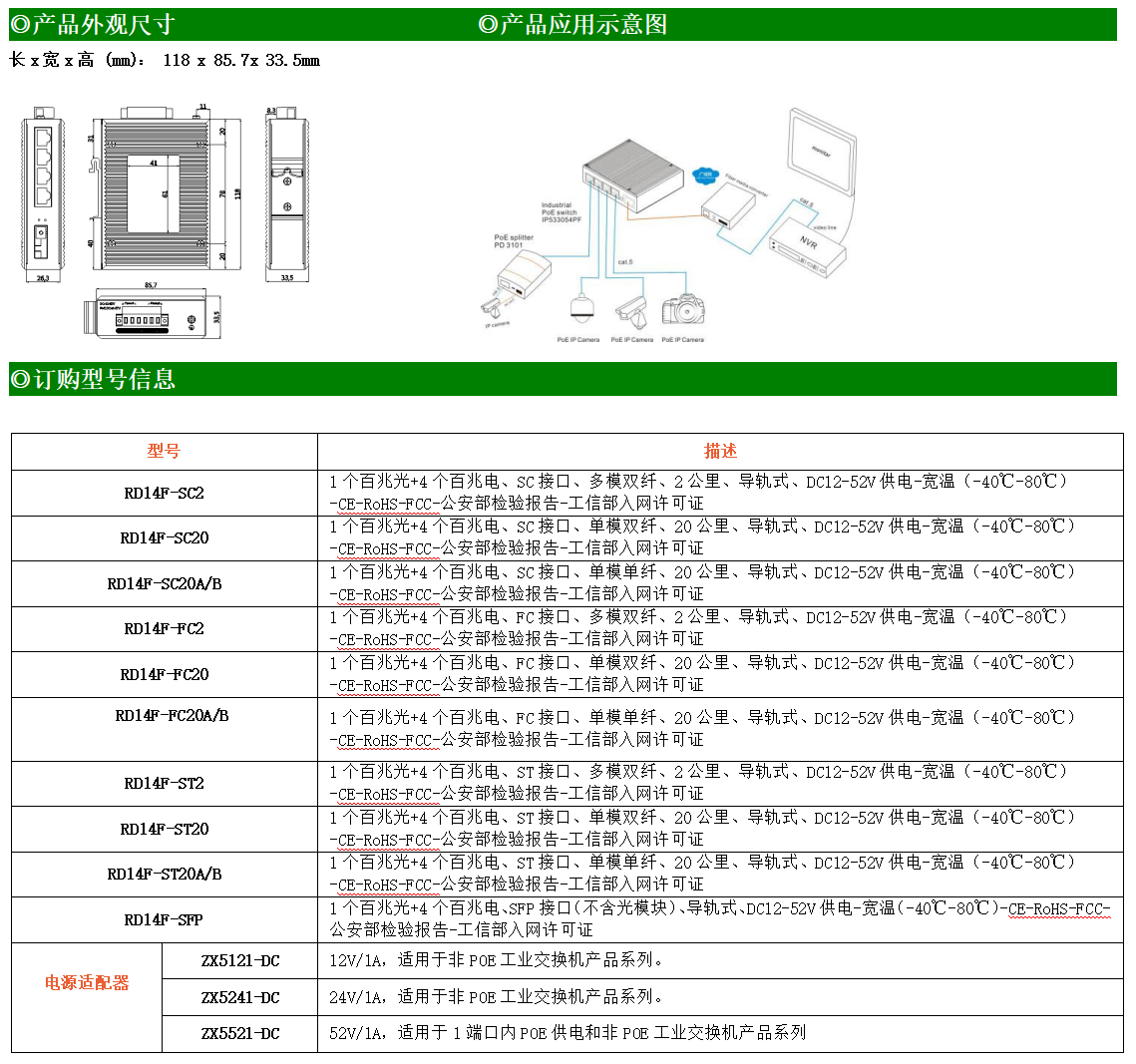 4路百兆電口+1路百兆FX光口工業級以太網交換機,支持4個10Base-T/100Base-TX電口和1個100Base-X光口。產品符合FCC、CE、ROHS標準。RD14F系列交換機具有-40℃~80℃的工作溫度,具有超強的堅固度能適應各種嚴苛環境,也可以非常方便的安置在空間緊湊的控制箱中。導軌的安裝特性、寬溫操作及擁有IP40防護等級的外殼及LED指示燈,使RD14F成為一個即插即用的工業級設備,為用戶的以太網設備聯網提供可靠、便捷的解決方案。