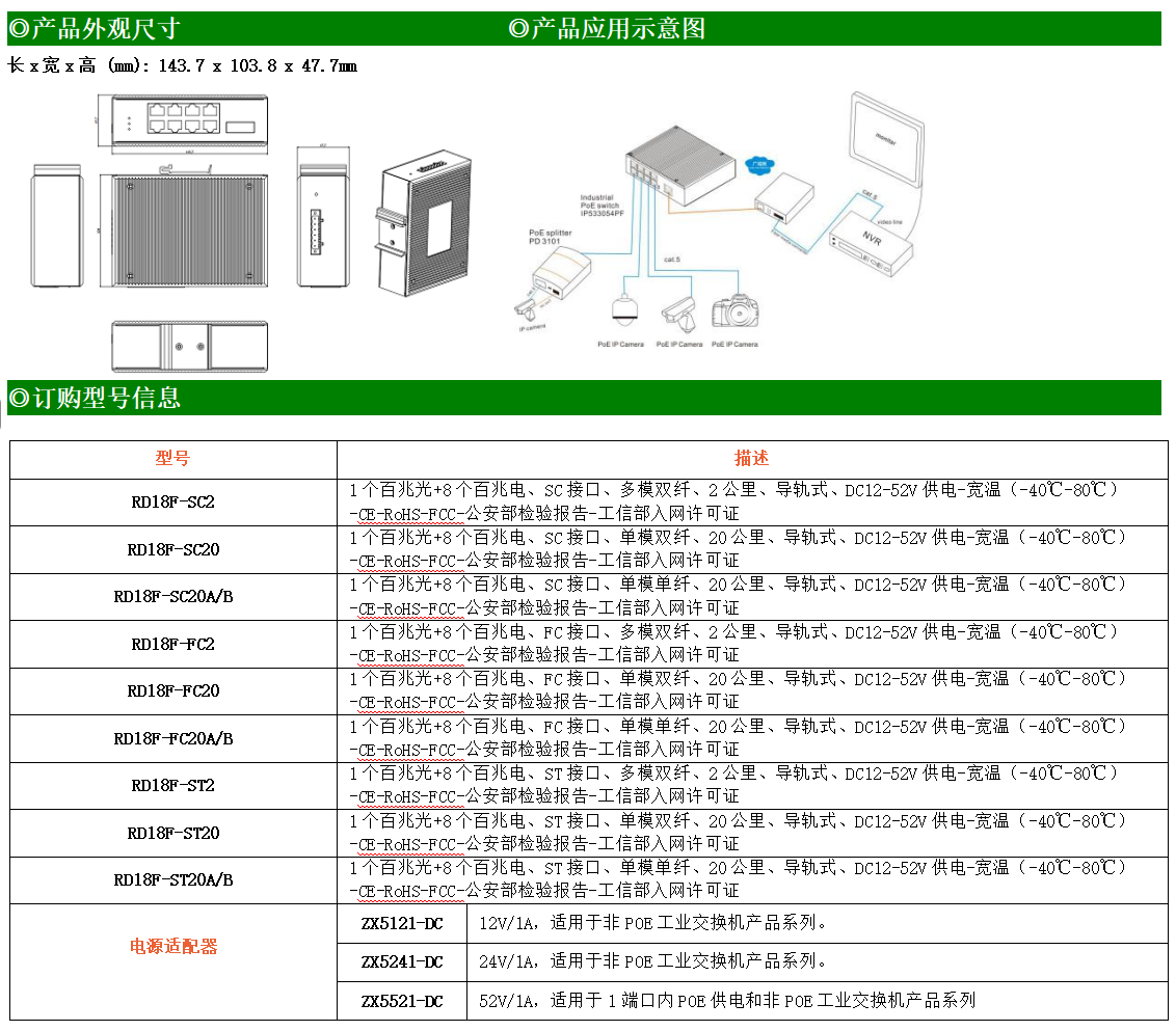 8路百兆電口+1路百兆FX光口工業(yè)級以太網(wǎng)交換機,支持8個10/100Base-TX電口和1個100Base-X光口。產(chǎn)品符合FCC、CE、ROHS標準。RD18F交換機具有-40℃~80℃的工作溫度,具有超強的堅固度能適應各種嚴苛環(huán)境,也可以非常方便的安置在空間緊湊的控制箱中。導軌的安裝特性、寬溫操作及擁有IP40防護等級的外殼及LED指示燈,使RD18F成為一個即插即用的工業(yè)級設備,為用戶的以太網(wǎng)設備聯(lián)網(wǎng)提供可靠、便捷的解決方案。