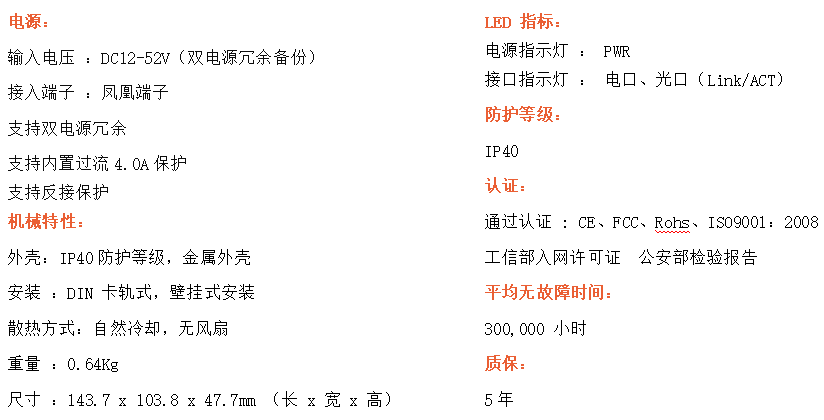 4路百兆電口+2路百兆FX光口工業級以太網交換機,支持4個10Base-T/100Base-TX電口和2個100Base-X光口。產品符合FCC、CE、ROHS標準。RD24F系列交換機具有-40℃~80℃的工作溫度,具有超強的堅固度能適應各種嚴苛環境,也可以非常方便的安置在空間緊湊的控制箱中。導軌的安裝特性、寬溫操作及擁有IP40防護等級的外殼及LED指示燈,使RD24F成為一個即插即用的工業級設備,為用戶的以太網設備聯網提供可靠、便捷的解決方案。