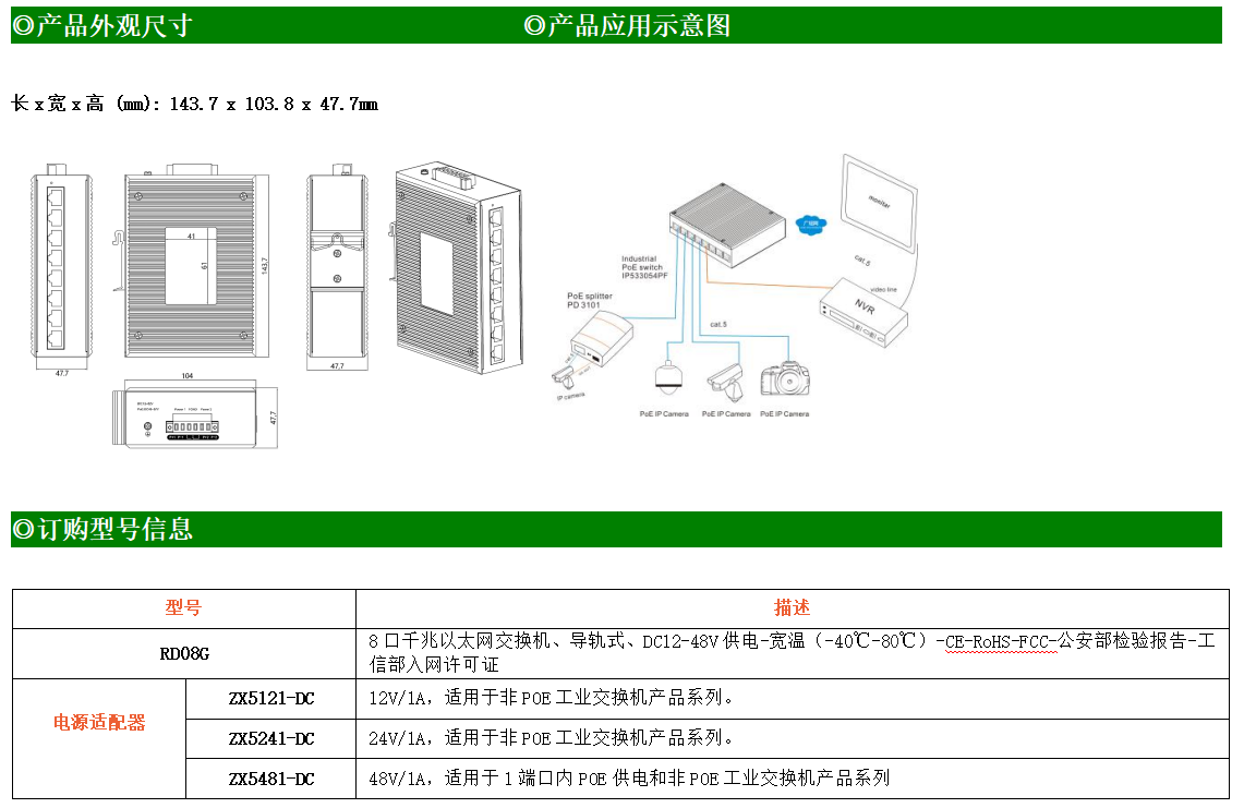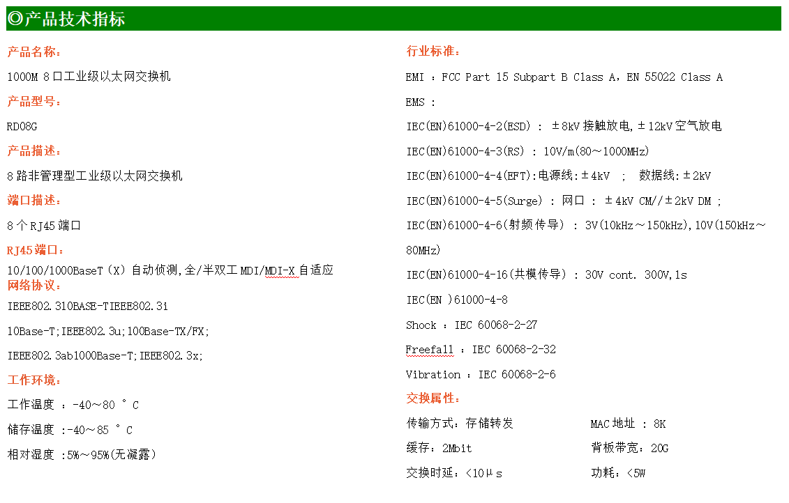 8路千兆電口工業(yè)級以太網(wǎng)交換機,支持8個10Base-T/100Base-T/1000Base-TX電口。產(chǎn)品符合FCC、CE、ROHS標(biāo)準(zhǔn)。RD08G交換機具有-40℃~80℃的工作溫度,具有超強的堅固度能適應(yīng)各種嚴苛環(huán)境,也可以非常方便的安置在空間緊湊的控制箱中。導(dǎo)軌的安裝特性、寬溫操作及擁有IP40防護等級的外殼及LED指示燈,使RD08G成為一個即插即用的工業(yè)級設(shè)備,為用戶的以太網(wǎng)設(shè)備聯(lián)網(wǎng)提供可靠、便捷的解決方案。