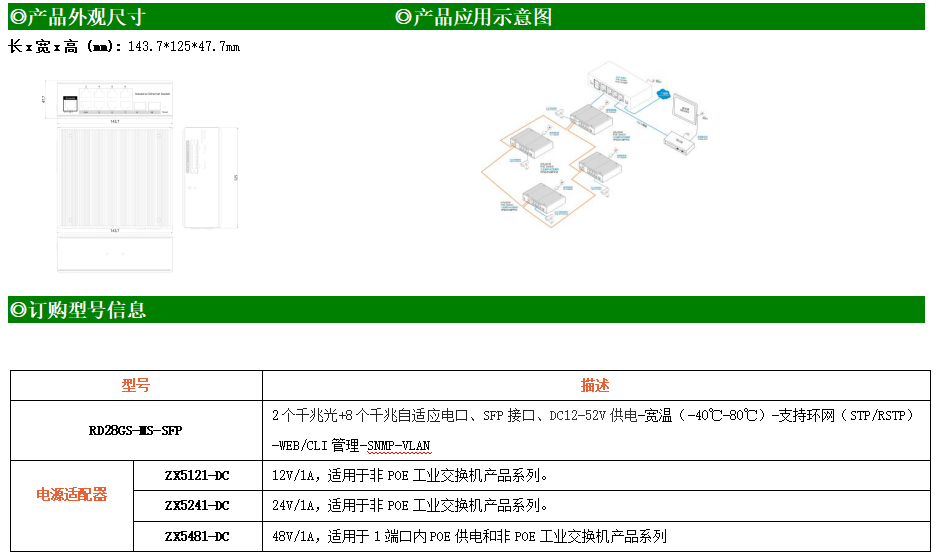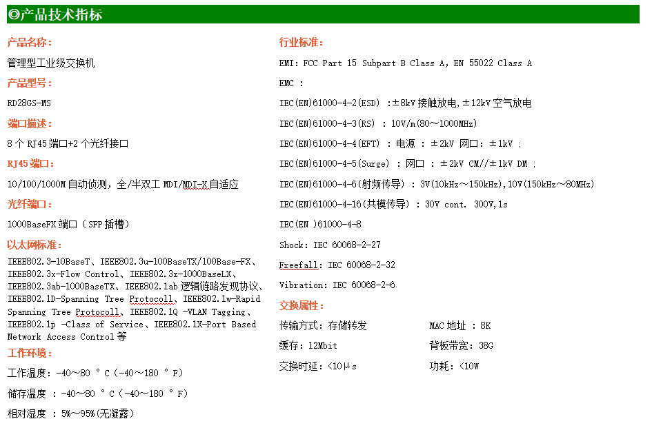 RD28GS-MS是網管型工業以太網交換機,產品符合FCC、CE、RoHS標準。支持2個千兆光口和8個千兆電口;支持工業現場所需的以太網二層協議,保證通信網絡的穩定性;該系列交換機采用低功耗、無風扇設計,確保無噪聲干擾,同時支持-40~80℃工作溫度和良好的EMC電磁兼容性能,保證在惡劣的工業環境中保持穩定的工作,為工廠自動化,智能交通,視頻監控等工業應用領域組建快速穩定的網絡終端接入網絡提供安全可靠的解決方案。