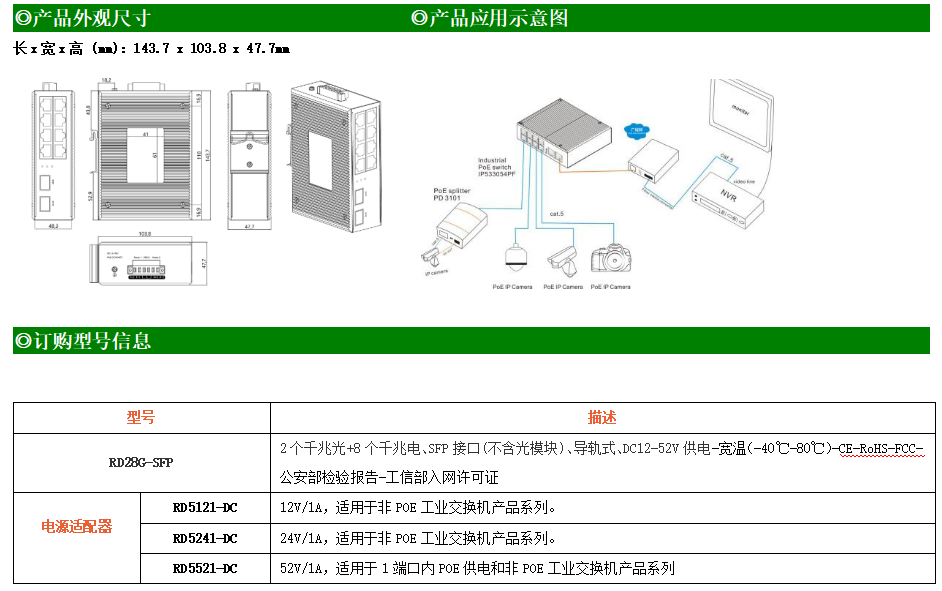 8路千兆電口+2路千兆FX光口工業(yè)級(jí)以太網(wǎng)交換機(jī),支持8個(gè)100Base-T/1000Base-TX電口和2個(gè)1000Base-X光口。產(chǎn)品符合FCC、CE、ROHS標(biāo)準(zhǔn)。RD28G交換機(jī)具有-40℃~80℃的工作溫度,具有超強(qiáng)的堅(jiān)固度能適應(yīng)各種嚴(yán)苛環(huán)境,也可以非常方便的安置在空間緊湊的控制箱中。導(dǎo)軌的安裝特性、寬溫操作及擁有IP40防護(hù)等級(jí)的外殼及LED指示燈,使RD28G成為一個(gè)即插即用的工業(yè)級(jí)設(shè)備,為用戶的以太網(wǎng)設(shè)備聯(lián)網(wǎng)提供可靠、便捷的解決方案。